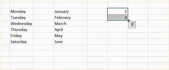 Đầu tiên, có thể nhanh chóng tạo ra danh sách các số đếm bằng cách nhập 1 vào ô đầu tiên, 2 vào ô bên dưới nó, rồi chọn cả hai ô, Fill Handle xuất hiện, kéo xuống các ô bên dưới cho đến khi đạt đến số mong muốn. Không nhất thiết phải điền từ 1, bạn có thể làm từ bất cứ số nào như 15, 20, nhưng nó chỉ có thể tạo ra một dãy số tiến, liên tục. Nghĩa là nếu điền 15, bạn sẽ tạo đc danh sách từ 15, 16, 17, 18,…