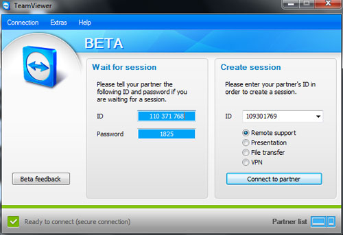 Nếu bạn muốn mình điều khiển máy tính của họ thì bạn yêu cầu họ gửi cho 2 cái này. Sau khi nhận được ID và Password của người bạn muốn điều khiển màn hình thì bạn copy ID vào ô ID trong mục “Create session” kia sau đó ấn “Connect to partner” ta được bảng như sau: